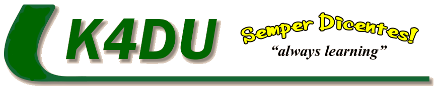 After a hiatus for school (West Chester University), service in the USAF and then school again (The Ohio State University BS '72 MA '74), I returned to the hobby and was licensed as KA8DOX in Columbus, Ohio. We moved to the Charlottesville (VA) area in 1982. In 1987 the callsign changed to N4ROD. In 1988 when I upgraded to Advance class the call sign changed to KM4DU and then in 1996 to K4DU.