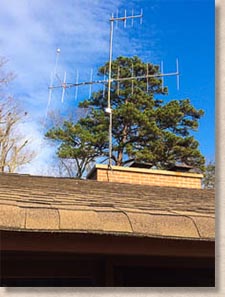 It was decided to remove the Diamond 2/440 from the chimney for relocation (another project). The 220 beam, if practical would be mounted above the new two meter beam. Mast sections were located from the boneyard stockpile and a tripod was set up in the back yard. I have found from experience that it is useful to set up and test antennas and rotators at or near ground level before installing them. It is much easier to make adjustment with your feet on the ground. And besides, we still were not certain that the TV rotator obtained from R&L Electronics would be sufficient to turn both antennas.
